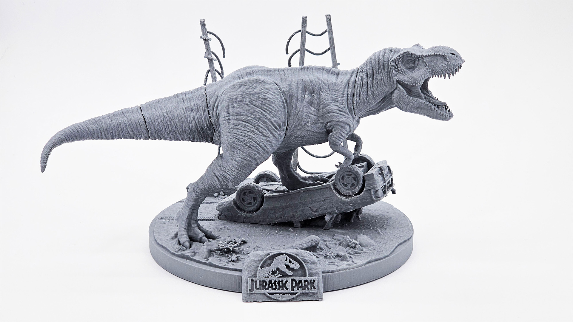 Ikonikus jelenetet megidéző Jurassic Park dioráma, amely a híres T-Rex támadást ábrázolja látványos részletességgel. A több darabból összeállítható modell MDF alapú 3D nyomtatással készült, ideális választás gyűjtők, filmes relikviák rajongói és modellezők számára.